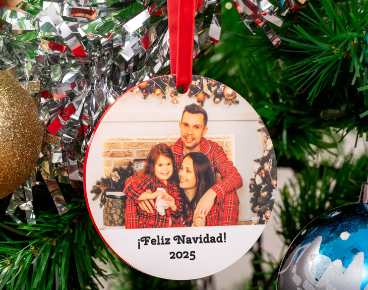 No hay nada más especial que vivir la Navidad en familia. Si este año queréis añadir un detalle único a vuestro árbol, nuestro adorno navideño de metacrilato personalizado con foto es la opción ideal. Convierte la decoración en recuerdos y, que decorar, sea un momento para atesorar juntos en familia. Perfecto para las primeras Navidades del bebé, para recordar un momento importante o simplemente para dar un toque original a la decoración. Podéis personalizarlo con vuestra foto favorita y el texto que queráis, creando un adorno único que destaca en cualquier árbol de Navidad. Añade el producto al carrito y en nuestro diseñador online sube la imagen, escribe vuestro mensaje y listo. Será un recuerdo precioso que cada año os emocionará al colocarlo en el árbol. ¡Una forma mágica y muy especial de vivir la Navidad! Dimensiones aproximadas: 8,5 cm. de diámetro.