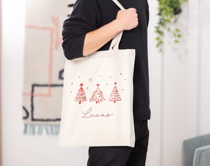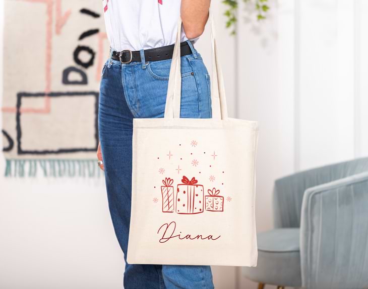 El espíritu de la Navidad lo invade todo y ahora también llega con esta preciosa bolsa tote personalizada. Con sus encantadores diseños navideños, llenos de magia y alegría, este accesorio se convierte en el compañero perfecto para hacer tus compras de regalos o para llevar la compra de las comidas familiares en estas fiestas. Esta bolsa personalizada de Navidad es ideal para llenarla de detalles y sorpresas para toda la familia. Se convierte en un envoltorio ecológico original y muy práctico, o incluso en el regalo de amigo invisible perfecto para ese compi del trabajo que siempre lleva mil cosas encima. ¡Le encantará! Los diseños no pueden ser más navideños: regalitos, arbolitos y hasta una guirnalda preciosa. Podrás elegir el que más te guste y añadir un nombre o una frase corta en la parte inferior. Así será totalmente única y, además, podrás usarla todo el año. Porque quienes amamos la Navidad la llevamos siempre en el corazón y ahora también en esta bolsa tote. Personalizarla es facilísimo: añade al carrito, elige tu diseño favorito, escribe el texto que quieras y listo. Tendrás el regalo original de Navidad más chulo y sostenible. Esta bolsa se puede reutilizar una y otra vez, ayudándote a decir adiós a las bolsas de plástico. Llévala contigo en cada compra, paseo o viaje y reparte espíritu navideño allá donde vayas. Medidas: 36,5 cm x 41 cm.