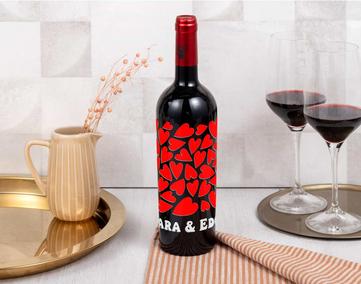 Si tu pareja es amante del vino y quieres sorprenderle en cualquier ocasión especial, o simplemente durante un fin de semana fuera de la rutina, esta botella de vino personalizada estampada con corazones retro es, sin duda, el detalle perfecto. Ideal como regalo para aniversarios, San Valentín o simplemente para decir “te quiero”. Te hará ganar muchos puntos extra en vuestra relación con un regalo único y lleno de estilo. ¿O conoces a alguien que sería feliz con una copa de vino y buena compañía? Entonces, esta botella de vino con nombre está hecha a su medida. Tiene un diseño divertido y original para los verdaderos amantes del vino. Puedes elegir entre dos opciones de personalización: coloca el nombre o el texto que desees y listo. Una excelente opción como regalo personalizado para parejas, detalle romántico, regalo de cumpleaños o recuerdo especial. Seguro que le parece una idea increíble. Personalizar es super sencillo: solo tienes que añadir el producto al carrito, elegir el diseño que más te guste, escribir el nombre o texto corto que desees ¡y listo! Podrás sorprender con este regalo romántico para parejas, ideal para celebrar el amor con un toque muy original. Utilizamos como base un exquisito vino de la Tierra de Castilla y León, cuya certificación de origen garantiza una calidad excepcional. Envejecido en barrica de roble, estamos ante un caldo sorprendente y lleno de matices. Su botella premium y su sabor cuidadosamente elaborado hacen de él el mejor regalo posible.