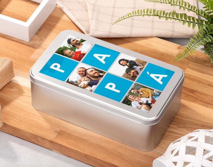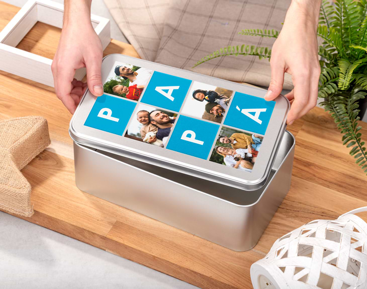 Personaliza esta lata de aluminio y haz que tus regalos del Día del Padre sean todavía más especiales. Porque la forma de regalar también cuenta, y con esta caja el detalle para papá se convertirá en una sorpresa aún más bonita y emocionante. Perfecta para convertir cualquier regalo en un momento inolvidable, tiene el tamaño ideal para guardar uno o varios detalles en su interior y hacer que la experiencia de abrirlo sea todavía más especial. Además, podrás personalizarla con 4 fotos de papá: con sus hijos, con la familia o con esos momentos que más os representan. Imagina su emoción al recibir un regalo tan personal. Personalizar esta caja de aluminio es muy sencillo. Solo tienes que añadir el producto al carrito, acceder a nuestro diseñador online, subir tus fotos y listo. Se convertirá en una forma original y emotiva de presentar cualquier detalle para papá. Importante: la caja se vende vacía, para que puedas llenarla con el regalo que tú elijas y crear una sorpresa totalmente a tu medida.