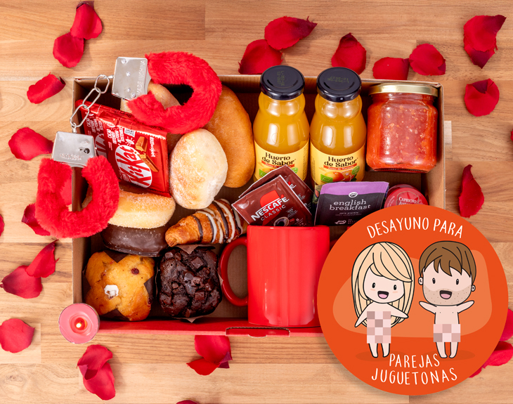 Contenido para 1 persona: • Caja. • Taza lisa (personalízala por 5€). • Manzana roja. • Café. • Té de varios sabores. • Zumo ecológico (Huerto de Sabor). • Bollería Artesanal: -Coulant de chocolate (artesanal). -Muffins con pepitas. (artesanal). -Donuts. -Mini Donuts. • Velita. • Pétalos. • Esposas. • Servilleta. • Tarjeta Recordatoria. Contenido para 2 personas: • Caja (personalizada o sin personalizar). • 2 Tazas blancas (personaliza cada una por 5€). • 2 Cafés. • Té de varios sabores. • 2 Zumos ecológico (Huerto de Sabor). • Bollería Artesanal: -Coulant de chocolate (artesanal). -Muffins con pepitas. (artesanal). -Donuts. -Mini Donuts. • Panes artesanales: - Pan chapata - Pan de cristal. - Pan brioche. • Tomate rosa de Barbastro triturado (300g). • 2 Aceites de oliva ecológicos 10 ml. • 2 cuberterías. • 2 servilletas. • Talonario con vales para parejas juguetonas. • 2 velitas. • Pétalos. • Tarjeta Recordatoria. Las tazas y los termos personalizados reemplazarán a los del desayuno. ¿Cómo incluir los productos opcionales? Una vez hayas seleccionado el tipo de desayuno, en el apartado de adicionales (paso 2) podrás añadir todos los productos opcionales que quieras.