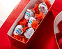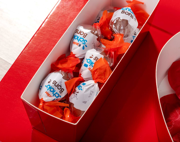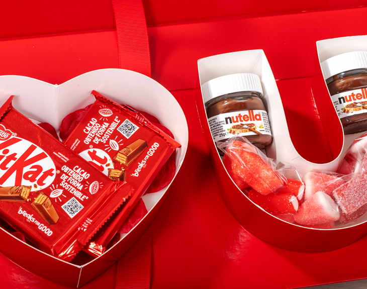 • Caja de cartón roja "I love you" personalizada. • Diez Chocolatinas Kinder Schokobons. • Dos KiKat. • Pétalos de rosa artificiales. • Bolsa de chuches rojas. • Dos mini botes de nutella. • Tarjeta Recordatoria.