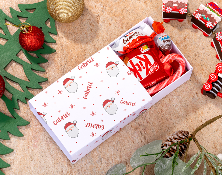 • Caja blanca de chuches. • Gorro de Papá Noel. • 1 Schoko-Bons. • 1 Kinder Bueno mini. • 1 Kit Kat. • 1 Bastón de caramelo. • Tarjeta Recordatoria.