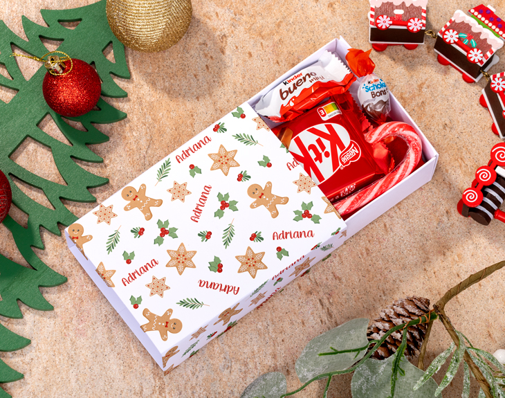 ¡La Navidad ya está aquí! Sin duda, es una época llena de magia e ilusión en la que recibimos un montón de regalos. Si es que año quieres ser original y sorprender a todos tus familiares... ¡Tenemos el detalle perfecto! Se trata de nuestra caja blanca navideña personalizada con diseño "Estampado Navideño". ¡Es genial! Esta cajita viene con todo lo necesario para celebrar una Navidad en condiciones. Incluye un bastón de caramelo, un gorro de Papá Noel, dos chocolates Kinder y un Kitkat. Y lo mejor de todo, esta cajita de color blanco es personalizable, podrás escribir el nombre que tú quieras. ¡Quedará genial! Personalizar esta caja navideña es muy sencillo. El primer paso a seguir consiste en añadir el producto al carrito y entrar al área de personalización. Una vez ahí, ya puedes escribir el nombre que tú quieras y nosotros nos encargamos de todo lo demás. ¡Será un original regalo para Navidad! Medidas: 14,1 x 11,1 x 4,5cm Importante: si puedes tener reacción a cualquier tipo de alérgenos, puedes escribirnos para consultar si hay alguna opción alternativa.