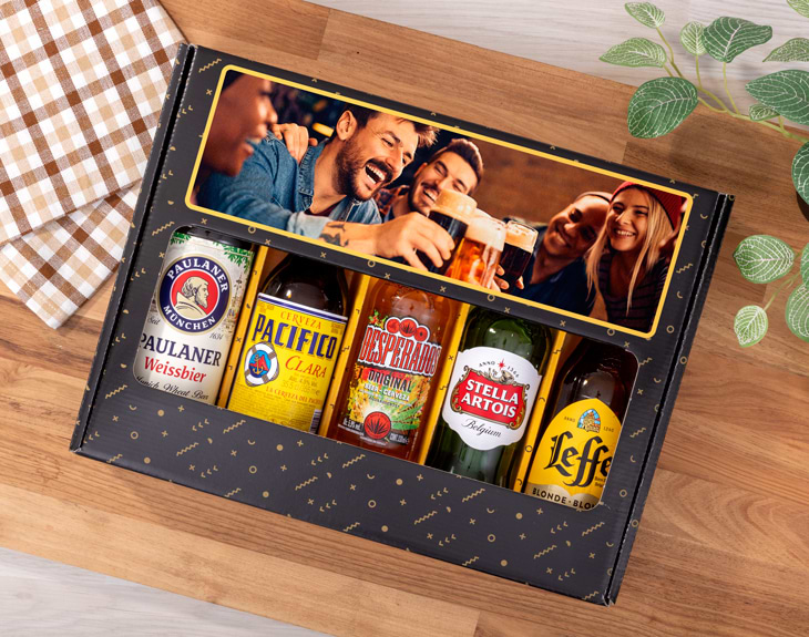 ¡Cuántos recuerdos especiales con gente tienes alrededor de unas buenas cervezas! ¿No te gustaría seguir creando momentos así? Nosotros te damos la excusa perfecta y ponemos el menú con este pack premium de las mejores cervezas. Lo único que tienes que hacer tú es buscar la mejor compañía y la imagen con la que quieres decorar esta preciosa caja negra con motivos amarillos. ¿No quieres hacer un regalo material? Regala el mejor sabor y tiempo para disfrutarlo juntos. Este set de las mejores cervezas del mundo puede ser un gran regalo original para las personas más cerveceras. Ya sea que prefieran una cerveza belga suave o una mexicana de arroz y lúpulo, en esta variedad de cervezas hay una para cada uno. Inmortaliza vuestros mejores momentos y el texto que quieras sobre esta caja de cartón para cervezas personalizada. Entra en nuestro diseñador una vez añadas el producto al carrito y podrás añadir todos los recursos que quieras para crear tu mejor diseño. El kit incluye cinco cervezas diferentes: - Pacífico: cerveza mexicana de agua, malta de cebada, arroz y lúpulo. 33cl. *Si Pacífico presenta problemas de suministro, este modelo de cerveza se sustituirá por otro similar e igual de delicioso. - Leffe Blonde: cerveza belga legendaria con una historia que se remonta al año 1240 en la ciudad de Dinant. 33cl. - Stella Artois: cerveza lager belga suave y con un frescor muy característico. 33cl. - Warsteiner: cerveza premium alemana que rinde homenaje a la cultura de su país. ¡Indispensable! 33cl. - Erdinger: cerveza de trigo de tradición bávara considerada la cerveza más grande del mundo. 50cl. Importante: Las cervezas que contiene el pack pueden variar según stock. El resto de cervezas disponibles son: - San Miguel 0,0% 25cl. - San Miguel Especial 25cl. - San Miguel sin glúten 33cl. - Desperados: primera cerveza con sabor a Tequila del mundo que combina la cerveza rubia lager con un toque especiado y cítrico. 33cl. - Mica: cerveza artesana española elaborada en la Sierra de Fuentenebro al amparo de este mineral con una cebada excelente. 33cl.