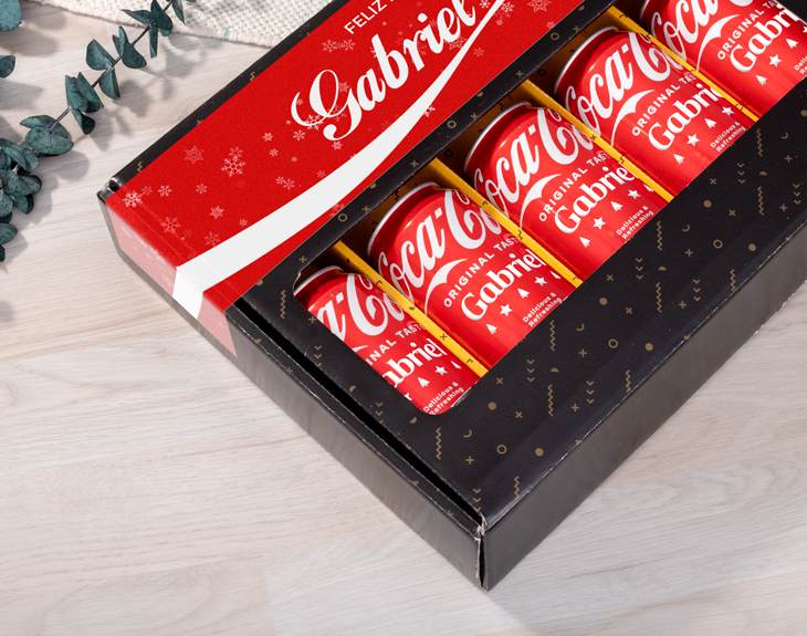 ¡Ho, ho, ho! ¡Llega la Navidad y con ella una ola de alegría y celebraciones! Si quieres llegar a la próxima reunión familiar o con tus amigos y triunfar por todo lo alto, tenemos justo lo que necesitas. Esta caja premium de Coca-Cola edición navideña personalizada es el regalo perfecto para sorprender a esa persona especial. Ideal para los auténticos fans de Coca-Cola, combina el espíritu navideño con un toque original. En esta edición especial de Navidad, las latas personalizadas con nombre serán la sensación de las fiestas. ¡Es lo más! La caja incluye cinco latas de Coca-Cola clásica, y lo mejor de todo es que podrás personalizar cada una con un nombre o mensaje diferente. ¡Perfecto para sorprender a toda la familia o a tu grupo de amigos! Además, podrás diseñar también la caja a tu gusto. Añade los nombres o mensajes que quieras y consigue que todos se emocionen al ver su bebida favorita con su nombre. Personalizarlo es muy fácil: añade el producto al carrito y entra en el área de diseño. Allí podrás escribir el texto que desees en cada lata y el mensaje que prefieras en la caja. ¡Y listo! Tendrás el regalo de Navidad personalizado más original y especial del mundo.