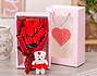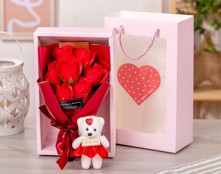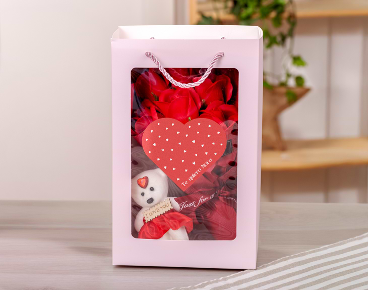 • Bolsa personalizada. • Ramo de flores artificiales aromáticas. • Osito "Love you". • Tarjeta recordatoria.