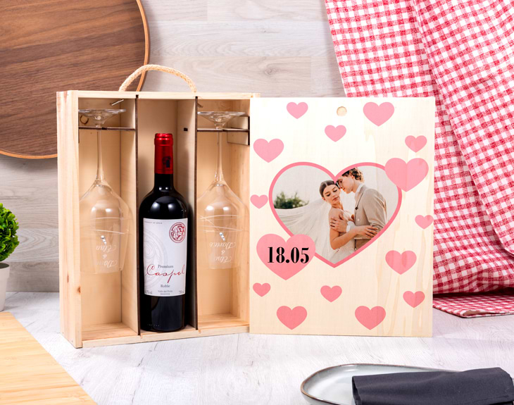 ¿Se acerca una fecha especial para ti y tu pareja? San Valentín, aniversario, cumpleaños... Hay muchísimas ocasiones en las que podemos tener un detalle con nuestra otra mitad y hacer que ese día destaque y lo recuerde con muchísimo cariño. Nuestra manera favorita de celebrar los eventos importantes es, sin duda, con una buena copa de vino y relajándonos al máximo. Por eso, nuestra caja de madera con botella y copas de vino es ideal para una ocasión así. Lo que hace realmente único a este regalo, es que la cajita de madera irá personalizada con vuestra foto y fecha especial. Para ello, solo tienes que escoger uno de los cuatro diseños que más te gusten (algunos permiten dos fotos o dos textos) y personalizarlo. Además, en las copas también podemos grabar vuestros nombres. ¡Es ideal para sorprender a tu pareja con una cenita romántica! Personalizar esta caja con botella y copas de vino es súper sencillo. El primer paso a seguir consiste en añadir el producto al carrito y entrar al área de personalización. Una vez ahí, ya puedes poner tus fotos favoritas y escribir lo que tú quieras. Pronto estará perfecto y listo para regalar. ¡Será un original regalo para enamorados!
