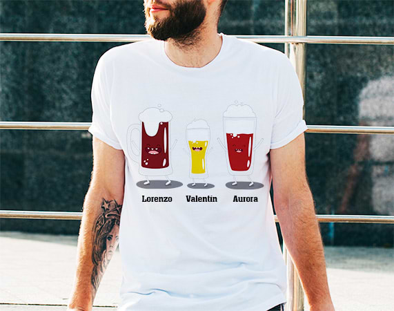 ¿Tu familia es la más cervecera del barrio? Este regalo original es perfecto para vosotros. Se trata de una camiseta personalizada que te permite crear un diseño muy divertido con una amplia variedad de tipos de cerveza. Elige las cervezas y ponles el nombre de tus padres y hermanos para personalizar esta camiseta tan molona. Importante: en función del número de cervezas, estas irán divididas en una o varias filas. Material: - Algodón: 100% algodón - Tacto algodón: 100% poliéster cotton touch - Técnicas: 100% poliéster Importante: a partir de 6 personajes irán distribuidos en dos filas. Es decir: - Familia de 6 personajes: 3 en la fila superior, y 3 en la inferior. - Familia de 7 personajes: 4 en la fila superior, y 3 en la inferior. - Familia de 8 personajes: 4 en la fila superior, y 4 en la inferior. Importante: Las medidas son aproximadas, pueden variar 5cm por encima o por debajo.