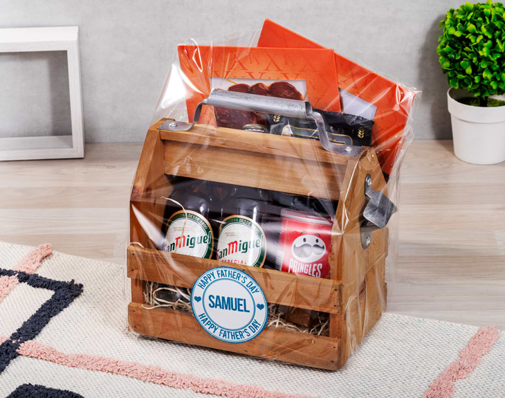 ¿Quieres sorprender al mejor padre del mundo con un regalo único? Esta cesta de madera personalizada es justo lo que necesitas para dejar al tuyo sin palabras en esa fecha tan especial. Porque si le gusta disfrutar de un buen picoteo de vez en cuando, esta cesta tiene todo lo necesario para que lo haga. Aprovecha el Día del Padre para entregarle un detalle que nunca olvidará. Y es que esta cesta hecha de madera contiene todo lo necesario para que tu padre disfrute de un momento salado perfecto. Una selección de nuestros mejores ibéricos, dos cervezas San Miguel, un bote de Pringles y unos picos para acompañar. ¡Lo tiene todo! Y espera porque todavía queda la mejor parte: ¡personalizar este regalo! Añádelo al carrito y entra en nuestro diseñador. Podrás escribir el nombre de papá en la pegatina que te mostramos en panatalla y que luego irá pegada coronando el exterior de la cesta. Vamos, que es perfecta para dejar a papá sin palabras. ¡Le encantará! Medidas de la cesta: 15 x 19,5 x 22 cm. Material: madera.