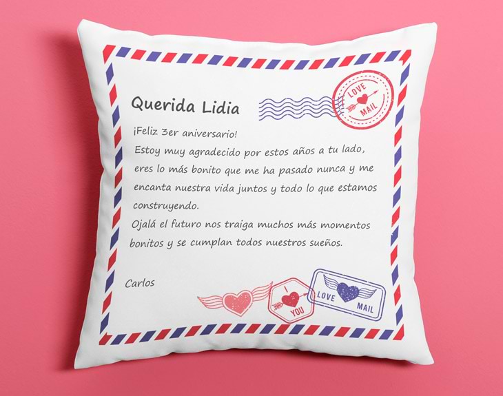 ¿Quieres declararle tu amor a una persona y que esa promesa perdure para siempre? Ya sea que llevéis 2 o 20 años juntos, a tu pareja le encantará saber lo que sientes por ella todos los días. Para ayudarte a ello, hemos creado este cojín personalizado con tu propia carta de amor. Escribe el texto que quieras y nosotros lo grabamos en la funda con este precioso diseño. Tienes hasta 300 caracteres para decirle que vas a seguir queriéndole/la cada día, para felicitarle vuestro aniversario o para cualquier otro mensaje que quieras expresarle. ¡Todo ello maquetado como si fuera una preciosa postal de amor! Así, cada día que vaya a echarse la siesta en el sofá o cuando se levante, recordará que sigues ahí a su lado. ¿Necesitas más espacio para el mensaje? ¡Llévate la taza a juego con el mismo diseño! Por tan solo 4€ más, podrás escribirle otro mensaje distinto para sorprender a tu pareja en otra ocasión. Así se levantará con energía por las mañanas al desayunar con tu taza, como si estuvieras a su lado diciéndole cada día esas palabras tan bonitas que le has grabado. Importante: si eliges la opción que incluye taza, esta será de cerámica.