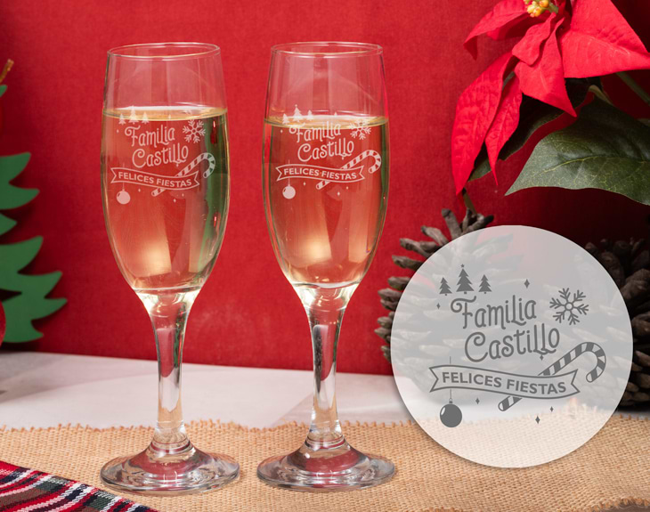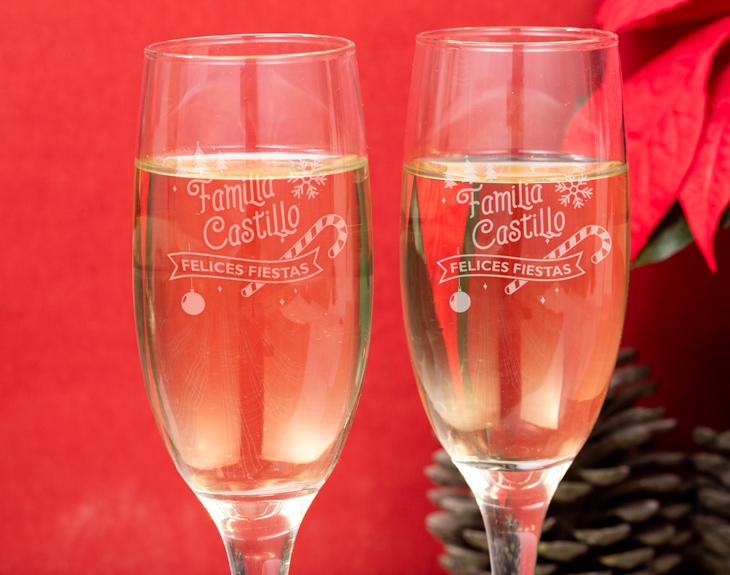Llega la época más feliz y bonita del año: la Navidad. ¿Te vas a reunir con tu familia este año también? Es el momento de brindar por todos y cada uno de ellos. Por eso, hemos diseñado estas copas de cava grabadas al más puro estilo navideño. Solo tendrás que decirnos un apellido o un texto para poder completar el diseño y personalizarlo exclusivamente para ti y tu familia. ¿Estás preparado para sorprender a tu familia en una época preciosa? Si eres de los que vuelves a casa por Navidad, aprovecha para poner muy contenta a la mejor mamá del mundo, y ganarte un abrazo de ese hermanito que tanto te echa de menos. Medidas: 18,3 cm de alto y 4,6 cm de diámetro.