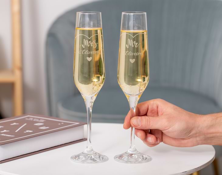 Si te sientes muy afortunado por haber encontrado el amor, está claro que es un motivo de celebración, y más si se acerca alguna fecha especial como San Valentín. Por eso, nuestras copas de cava con Swarovski® con diseño "Mr. & Mrs." son ideales para esta ocasión tan especial. ¡Triunfarás seguro! Gracias a esas copas podréis brindar por vuestro amor y por lo mucho que os queréis. Son ideales para sorprender a tu pareja con una cenita romántica y con un brindis de cava para celebrar. Imagina la ilusión que le hará ver vuestros nombres grabados en estas copas tan elegantes, sin duda, le encantarán. Lo más especial de estas copas de cava tan guays es que son personalizables. Tú nos dices los nombres que tú quieras y nosotros los grabamos en la superficie de estas copas. Para personalizar estas copas de cava es súper sencillo. El primer paso a seguir consiste en añadir el producto al carrito y entrar al área de personalización. Pronto estarán perfectas y listas para regalar. ¡Será un original regalo para enamorados! Cómo cuidar tus copas: para mantener la belleza de tus copas por favor sigue las instrucciones con cuidado. Es importante evitar que sean expuestas a altas temperaturas. Lávalas siempre a mano, con mucho cuidado de no dañar los cristales. Seca con un trapo suave, sujetando la pieza por la parte superior. No aptas para lavavajillas. Capacidad de las copas: 210 ml. Medidas de las copas: 26 cm de alto.