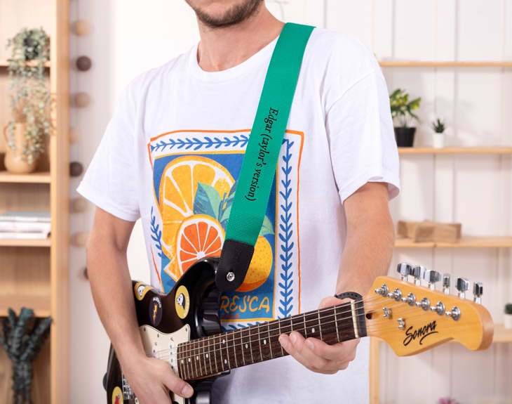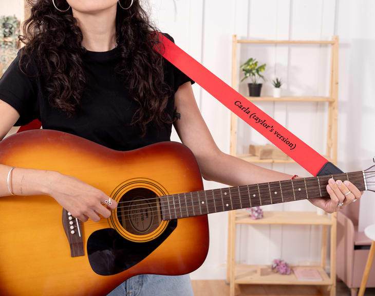 Es hora de seguir los pasos de Taylor Swift y sacar tu mejor versión. Así que si tocas la guitarra, estás de suerte, porque esta correa personalizada es el mejor regalo que puedes hacerte a ti mismo o a cualquier fan de la cantante americana. Si te sabes todas las canciones Taylor's version, plasma este mensaje en la correa de tu guitarra para que sea el accesorio más original y diferente del mundo. Además, podrás escoger el color que más te guste para tu correa y empezar a tocar esas canciones que tanto te gustan. Y para personalizar esta correa, solo tienes que acceder a nuestro diseñador para poder escribir el nombre que quieras junto a este característico diseño. Colócalo a tu gusto y la correa estará lista para vivir miles de aventuras y conciertos. Medidas aproximadas: - Ancho: 5 cm - Longitud ajustable de 89 cm hasta 150 cm.