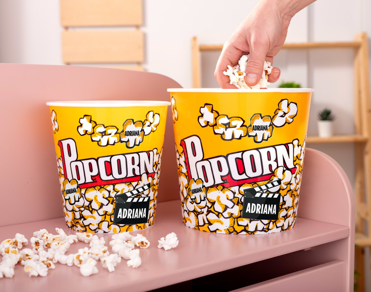 Convierte cualquier plan de cine en casa en una experiencia única con estos cubos de palomitas personalizados. Un detalle original, divertido y personalizable que hará que cada maratón de series sea todavía más especial. Porque no es lo mismo ver una película que hacerlo con tu propio cubo de popcorn con nombre. Con un diseño lleno de color, estos cubos de palomitas personalizados son ideales para sorprender tanto a niños como a adultos. Puedes añadir el nombre que quieras y crear un regalo original para cumpleaños, noches de cine, fiestas temáticas o simplemente para darte un capricho. El tamaño pequeño es perfecto para los más peques o para raciones individuales, mientras que el tamaño grande es ideal para compartir… o no. Además de ser prácticos, estos cubos de palomitas reutilizables se convierten en un recuerdo original que podrás usar una y otra vez. Son perfectos como regalo para cinéfilos, amantes de las series o para quienes disfrutan de los pequeños momentos en casa con palomitas recién hechas. Personalizarlos es muy fácil: elige el tamaño que prefieras, añade el nombre y listo. En pocos pasos tendrás un regalo original y personalizado con ese toque especial que solo los detalles hechos a medida pueden ofrecer. Con estos cubos de palomitas personalizados, el plan perfecto empieza mucho antes de comience tu película favorita. Capacidad: - Cubo pequeño 2,8 L - Cubo grande 5 L