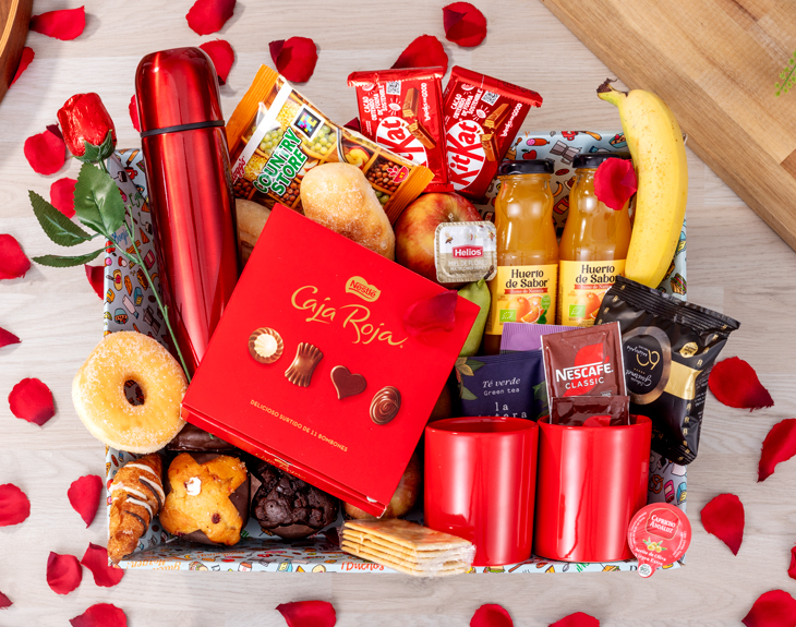 Si es para 2 personas se duplica todo el contenido menos el termo, la rosa y los bombones.