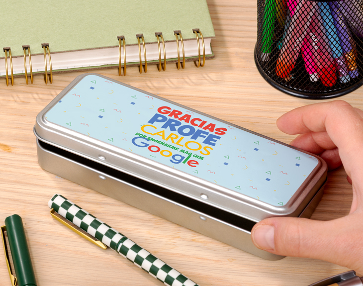 Si tu profe es como un enciclopedia y siempre tiene respuesta a todas las preguntas que le hacéis en clase, este estuche metálico personalizado es perfecto para darle una sorpresa enorme a la mejor profesora del mundo. Dale las gracias por enseñarle tanto, y descubre también el lado más tierno de tu profe. Seguro que se pone muy contenta y os echa de menos todo el verano. ¡Haced que vuestra clase sea la mejor del mundo para ella! Material: aluminio. Medidas: 2,5 cm x 7,5 cm x 18,5 cm.