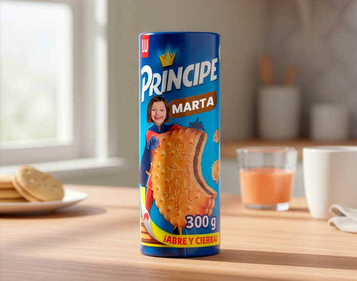 Si hay algo que nunca pasa de moda, son las míticas galletas Príncipe. Ahora imagina poder convertirlas en un detalle todavía más divertido… Con nuestras Galletas Príncipe personalizadas con cara, el clásico de siempre se transforma en un regalo original que arrancará sonrisas desde el primer vistazo. Este paquete se personaliza con la cara que tú elijas, simulando la imagen del auténtico príncipe del envoltorio. Además, podrás añadir el nombre que quieras para que el diseño sea aún más especial. El resultado es un regalo divertido y totalmente personalizado. Es el detalle perfecto para sorprender a quienes aman estas deliciosas galletas: niños que se sentirán protagonistas de su propio paquete, adultos que volverán a la infancia de un solo vistazo o cualquier persona con sentido del humor y pasión por el chocolate. Ideal para cumpleaños, fiestas infantiles, detalles originales, amigo invisible o simplemente para tener un regalo diferente con el que acertar seguro. Porque no es solo un paquete de galletas… es una versión personalizada de un clásico que todos conocemos. ¿Cómo personalizarlas? Muy fácil. Añade el producto al carrito y accede al área de personalización. Sube la foto de la cara que quieras incluir y escribe el nombre. Nosotros nos encargamos de crear el diseño para que quede perfecto y listo para regalar. Un regalo original y delicioso que convierte unas galletas de siempre en una sorpresa inolvidable.