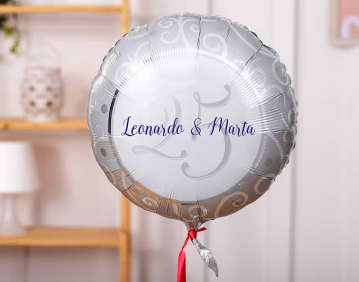 Para una pareja, el momento de celebrar las Bodas de Plata es de los más especiales que existen. Y en esa ocasión no puede faltar un globo de gas, perfecto para dar un toque desenfadado a una efeméride tan importante. ¡25 años de casados no se cumplen todos los días! Importante: Excepto en la opción desinflada, en el resto de alternativas se presenta el globo hinchado y sujeto a un osito de peluche. Si seleccionas el globo desinflado, no se podrá inflar a pulmón.