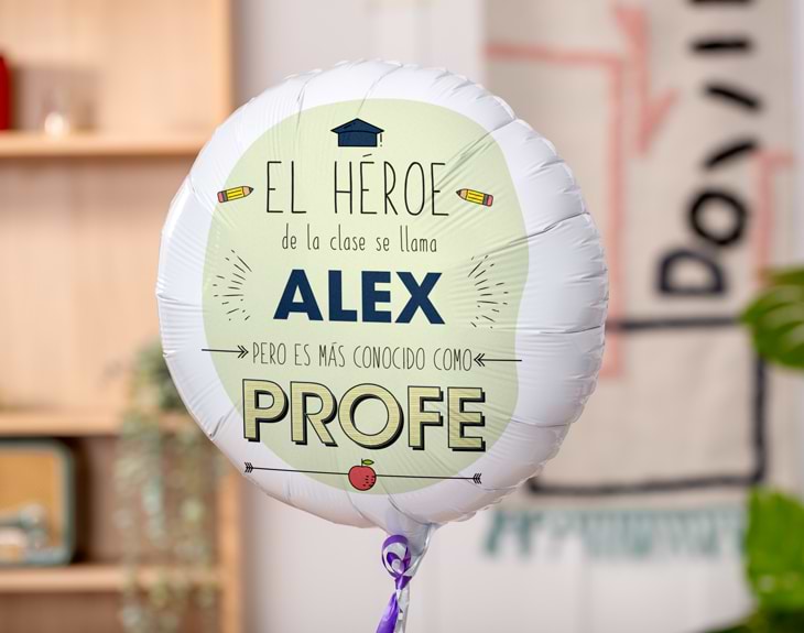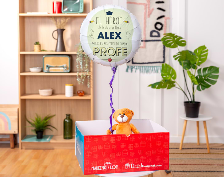 Si te has puesto de acuerdo con toda tu clase y queréis hacerle un detallito a la profesora o profesor, este globo personalizado es perfecto para disfrutar de su cara de sorpresa. Solo tenéis que decirnos el nombre del profe y personalizaremos este globo para que sea único y fantástico. Se trata de un regalo original muy chulo, pues el globo va sujeto a un osito de peluche. Cuando se abra la caja, saldrá el globo y la sonrisa del peluche. Es un regalo perfecto para dejar huella en el colegio. Importante: a la hora de personalizar este producto, se te dará la opción de elegir entre "héroe" o "heroína". Excepto en la opción desinflada, en el resto de alternativas se presenta el globo hinchado y sujeto a un osito de peluche. Si seleccionas el globo desinflado, no se podrá inflar a pulmón.