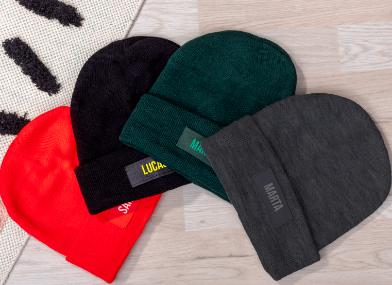• Gorro de punto con etiqueta personalizado. • Tarjeta recordatoria.
