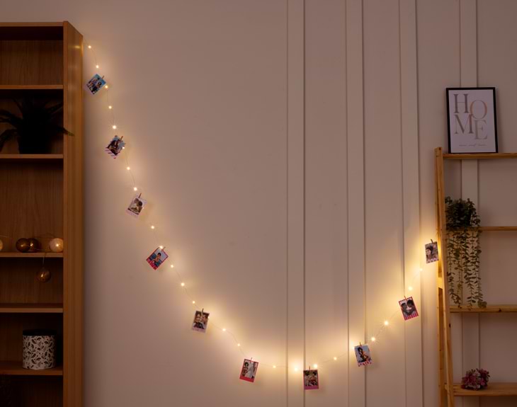 • Guirnalda de luces a pilas. • 10 fotos Polaroid personalizadas. • 10 Pinzas de madera pequeñas. • Tarjeta Recordatoria.