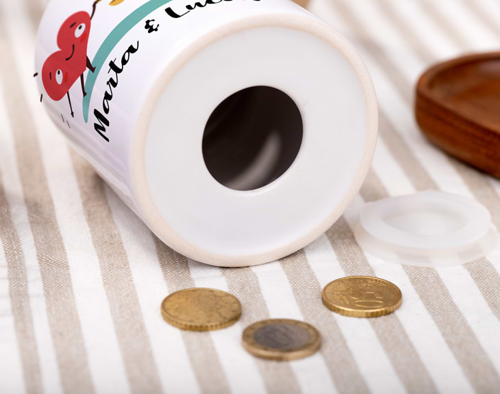 ¿Has encontrado el amor de tu vida? ¿Estás seguro o segura de que va a ser tu compañero o compañera de vida? Es el momento de ahorrar para empezar un futuro juntos. Seguro que ya habéis hablado del piso que queréis comprar, del primer viaje grande e importante que queréis hacer o, incluso, de empezar a pensar en la educación de los futuros hijos. Si es así, esta hucha de cerámica personalizada es perfecta para darle una sorpresa a tu pareja. Solo tendrás que elegir los corazones que más os representen (máximo 8 corazones) y ponerles el nombre que quieras. ¡Será un regalo precioso para empezar a ahorrar por una vida maravillosa juntos! Importante: nuestro equipo de personalización se encargará de ajustar la distribución de los personajes en el producto en función de su tamaño para que se vean lo mejor posible. Importante: la hucha cuenta con una apertura de tapón oculto en la parte baja para extraer el dinero. Altura: 9,5cm.
