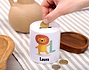• Hucha de cerámica con tu foto y/o diseño en cajita individual. • Tarjeta recordatoria.