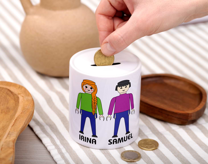 ¿Recuerdas todas esas tardes en familia jugando con los Playmobil? Si estos divertidos muñecos han ocupado un lugar super importante de tu infancia, esta hucha personalizada tiene tu nombre. ¡También es una opción fantástica para sorprender a esa persona que te acompaña en todas tus locuras! Y es que, si estabais pensando en empezar a ahorrar para hacer realidad ese viaje con el que lleváis mucho tiempo soñando, este regalo original le encantará. Así cada vez estaréis un poquito más cerca de conseguir vuestro objetivo. Ya podéis empezar a mirar billetes, porque seguro que en nada lográis ahorrar es dinero. ¡Y es que, con esta hucha será mucho más fácil! Importante: a partir de 6 personajes. se colocarán en dos filas. Es decir: - Familia de 6 personajes: 3 en la fila superior, y 3 en la inferior. - Familia de 7 personajes: 4 en la fila superior, y 3 en la inferior. - Familia de 8 personajes: 4 en la fila superior, y 4 en la inferior. Importante: la hucha cuenta con una apertura de tapón oculto en la parte baja para extraer el dinero. Altura: 9,5cm.
