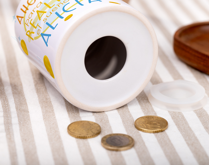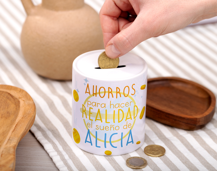 ¿Quieres ayudar a esa persona tan especial a hacer realidad sus sueños? ¡Tenemos el detalle perfecto para demostrarle que apoyas cada uno de sus pasos! Se trata de una hucha personalizada con un mensaje super positivo para darle un chute de motivación. ¡Así podrá empezar a ahorrar para conseguir su sueño! Ya sea para emprender y abrir su negocio, para hacer ese viaje que siempre ha querido o para comprar la casa de sus sueños. Poco a poco, con mucho esfuerzo e ilusión podrá conseguirlo, ¿y sabes qué es lo mejor de todo? que tú estarás a su lado viéndolo y celebrándolo. Basta con que nos digas su nombre para que podamos insertarlo en el diseño y hacer que sea la hucha más guay del mundo. Y es que, seguro que le encanta y cada vez que llegue a casa guarda dinero para estar más cerca de su objetivo. Importante: la hucha cuenta con una apertura de tapón oculto en la parte baja para extraer el dinero. Altura: 9,5cm.