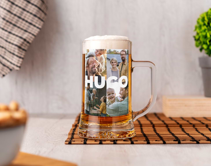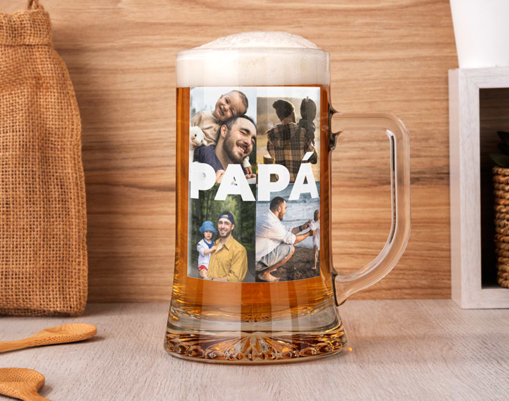 Hay personas que siempre están ahí, que enseñan, cuidan y acompañan sin pedir nada a cambio. Con la jarra de cerveza impresa “Papá collage” podrás agradecerle a papá todo lo que significa con un detalle pensado para emocionar y sacar una sonrisa en cada brindis. Esta jarra de cerveza personalizada para el Día del Padre se imprime a todo color con un diseño de collage de fotos y el texto “PAPÁ” o si quieres poner su nombre. Un homenaje visual a los mejores momentos compartidos: una foto familiar, una aventura juntos, una risa inolvidable o ese recuerdo que siempre os une. Cada imagen convierte la jarra en un regalo único y lleno de significado. Es el detalle perfecto para sorprender en el Día del Padre, en su cumpleaños o en cualquier ocasión especial en la que quieras decirle gracias de una forma diferente. Ideal para disfrutar de su cerveza favorita, para presumir de regalo o simplemente para recordar cada día lo importante que es. Personalizar esta jarra de cerveza para papá es muy sencillo. Solo tienes que añadir el producto al carrito y acceder a nuestro diseñador online. Allí podrás subir las fotos y colocarlas dentro del diseño del collage. Nosotros nos encargamos de que el resultado quede perfecto y listo para regalar. Un regalo original para el Día del Padre que convierte cada brindis en un momento especial. Importante: esta jarra no es apta para lavavajillas. Diámetro interior: 7 cm Medidas aproximadas: 8,5 x 15,5 cm