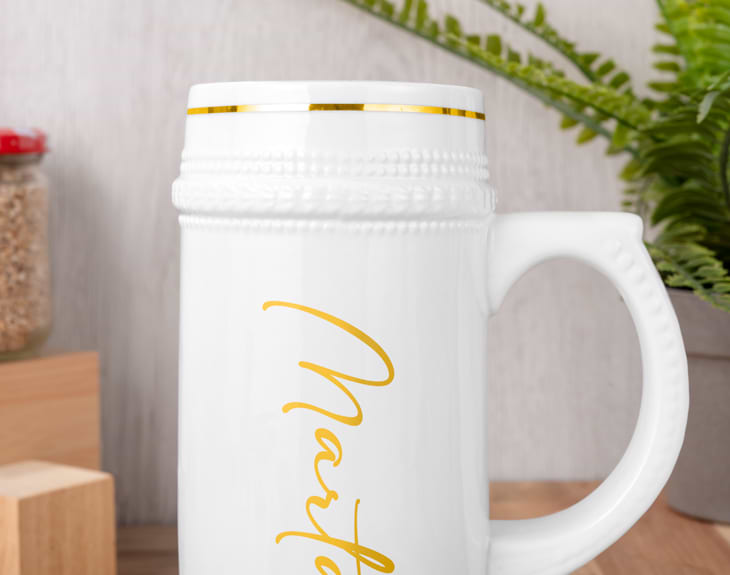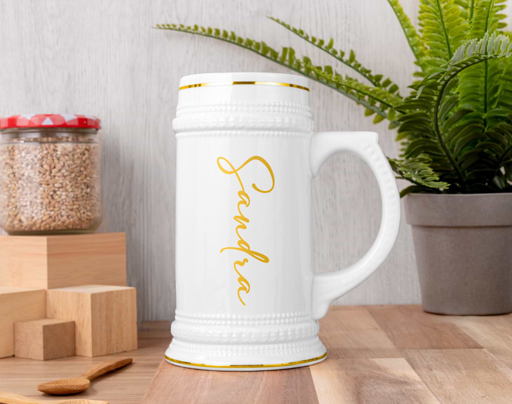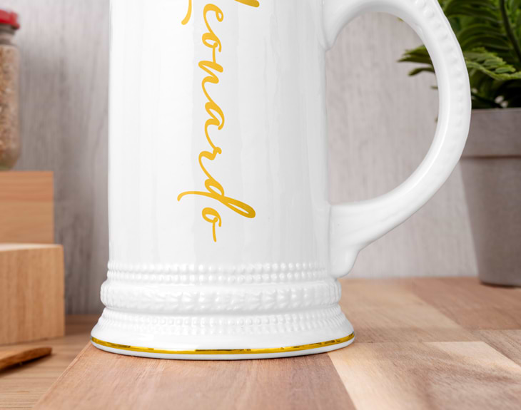 Atención amantes de la cerveza: tenemos el regalo perfecto para vosotrxs. Esta elegante jarra de cerveza personalizada es ideal para que puedas disfrutar de tu bebida favorita siempre que te apetezca. Si te haces con ella, ya no tendrás excusa para beberte tu cerveza favorita desde casa. Sorprender a alguien que ama la cerveza, es muy sencillo gracias a esta original jarra hecha de cerámica, de color blanco y con pequeños detalles dorados. Y para darle ese toque que la convierte en algo especial, nos encargaremos de imprimir el nombre que quieras en ella con esta letra tan bonita. ¡Quedará genial! Entra en el área de personalización, escrib el nombre que quieras en el espacio que te mostramos, colócalo a tu gusto y listo. Nosotros nos encargamos del resto para que tú solo la recibas y te bebas esa cerveza que tanto te gusta. ¡No habrá un regalo mejor! Capacidad: 45 cl. Altura aproximada: 16,5 cm. Diámetro de la base: 9 cm.