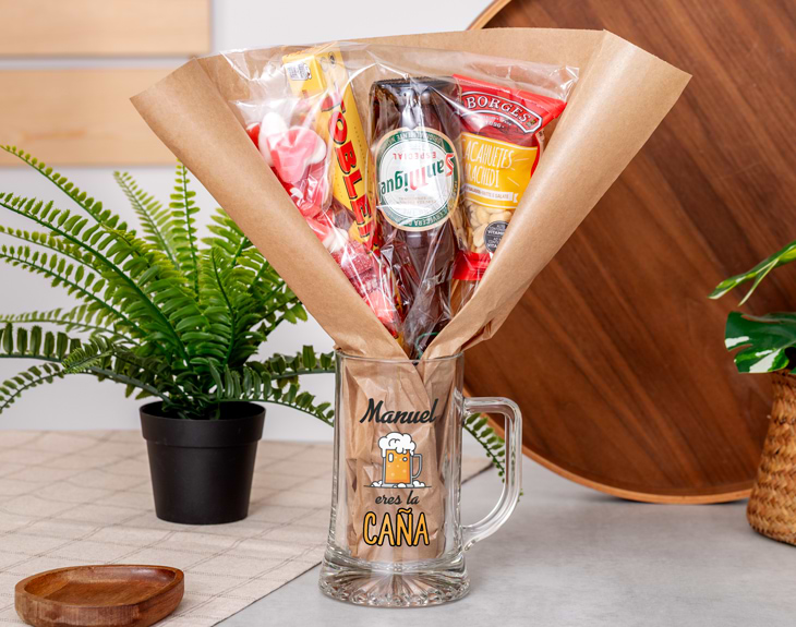 Si tienes un amigo que siempre está ahí, que organiza los planes, que anima cualquier quedada o que simplemente… es la caña, este detalle está hecho para él. Con este ramo de snacks con jarra de cerveza personalizada “Eres la caña” tendrás el regalo perfecto para sorprender con algo original, divertido y muy personal.