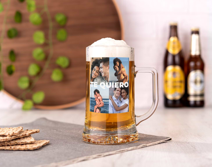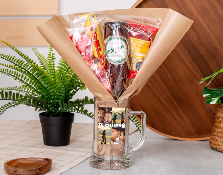 Pero lo mejor de este ramo de comida es su jarra de cerveza personalizada a color. Podrás crear un precioso collage con cuatro fotos vuestras y añadir un texto especial, como un “Te quiero”, vuestros nombres o una frase que solo tenga sentido para vosotros. Un recuerdo único que convertirá cada cerveza en un brindis por vuestra historia de amor.