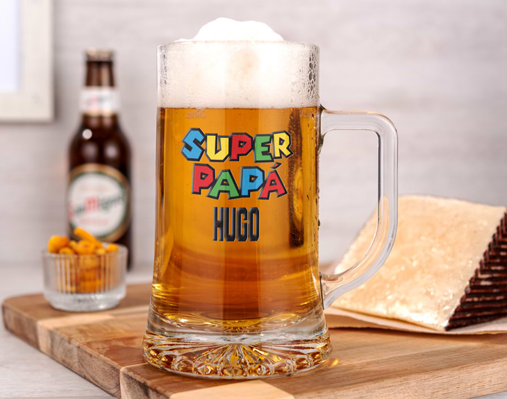 Si tu padre es de los que siempre están ahí para salvar el día, este detalle le encantará. Con esta jarra de cerveza personalizada “Superpapá Mario Bros”, se convertirá oficialmente en el héroe favorito de la familia. Un diseño divertido inspirado en el mítico universo de Super Mario Bros que hará que cada brindis tenga un toque épico. Esta jarra de cerveza impresa a color y personalizada con nombre es perfecta para sorprenderle en el Día del Padre, su cumpleaños o cualquier ocasión especial. Podrás añadir su nombre en el diseño, convirtiéndolo en el auténtico protagonista de esta aventura. Porque no todos los héroes llevan capa… algunos llevan jarra. Fabricada en cristal y con impresión de alta calidad, es ideal para disfrutar de su cerveza favorita bien fría mientras revive sus recuerdos gamer o simplemente se relaja en casa. Sin duda, un detalle original que unirá dos de sus cosas favoritas: la cerveza y las aventuras más divertidas. Personalizar esta jarra para papá es muy fácil. Solo tienes que añadir el producto al carrito, acceder al área de personalización y escribir su nombre. Nosotros nos encargaremos de que esté listo para regalar. Un regalo original para padres que le sacará una sonrisa en cada brindis. Importante: esta jarra no es apta para lavavajillas. Diámetro interior: 7 cm Medidas aproximadas: 8,5 x 15,5 cm