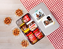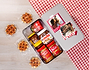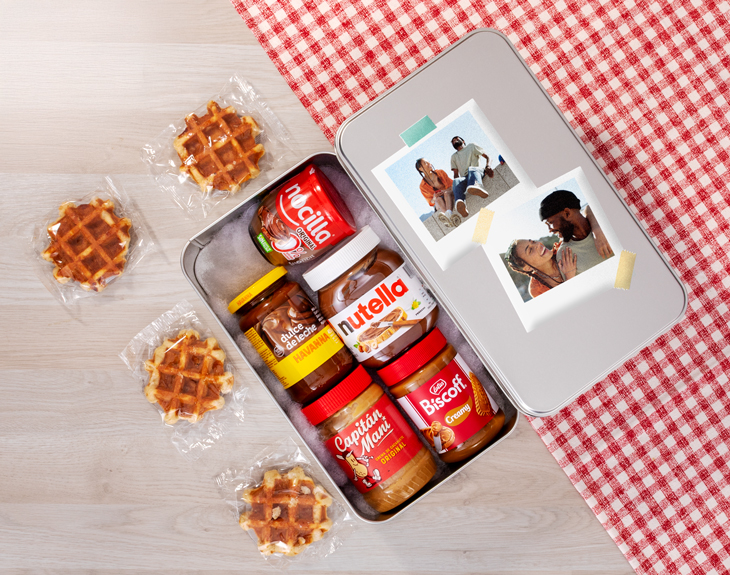 • Lata personalizada. • 4 gofres. • Bote de Nutella. • Bote de Nocilla. • Bote de Dulce de Leche. • Bote Capitán Maní. • Bote de crema Bíscoff. • Tarjeta Recordatoria.