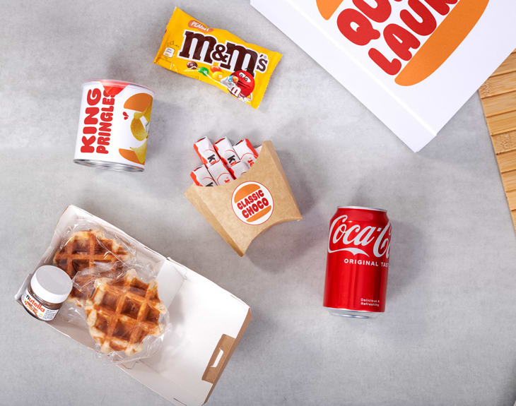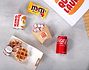 • Caja de cartón blanca personalizada (25x18x11cm). • Lata de Coca-Cola. • Bote de Pringles. • Mini bote de Nutella. • Dos mini gofres. • Bolsita de M&MS. • Seis barritas kinder. • Caja kraft patatas fritas. • Caja kraft hamburguesa. • Tarjeta recordatoria.