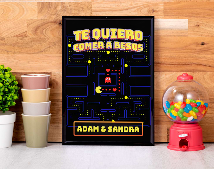Si el amor que sientes por tu pareja es tan grande que no puedes evitar quererla a besos… esta lámina personalizada “Te quiero comer a besos” es justo lo que estabas buscando. Un diseño inspirado en el mítico comecocos que mezcla nostalgia, humor y mucho amor, perfecto para arrancar sonrisas desde el primer momento. Esta lámina original para parejas es ideal para sorprender en un aniversario, en San Valentín o simplemente para recordarle cada día lo mucho que te importa. Además, es personalizable: podrás añadir los nombres, una fecha especial o ese mensaje corto que solo vosotros entendéis, convirtiéndola en un recuerdo único y lleno de cariño. Personalizar tu lámina es facilísimo. Solo tienes que añadir el producto al carrito y acceder al área de personalización. Allí podrás escribir el texto que desees y adaptar el diseño a vuestro estilo. Nosotros nos encargamos de que el resultado sea perfecto, listo para decorar vuestro hogar con una sonrisa y mucho amor. Sin duda, un regalo divertido y romántico que no pasará desapercibido. Importante: el color del marco puede variar según disponibilidad de stock. Importante: las opciones de lámina grande y gigante no incluyen marco; únicamente la opción A4 lleva marco incluido. Puedes elegir esta lámina en el tamaño que prefieras: A4 · Grande (48 × 33 cm) · Gigante (85 × 60 cm) Importante: si seleccionas la opción «versión digital», recibirás el diseño en alta resolución por email, listo para imprimir en el formato que quieras. Para ello, deberás seleccionar «Recibir por Email para ahorrar los gastos de envío» en el formulario de entrega.