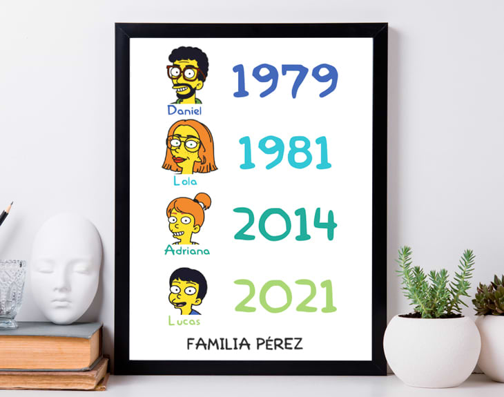 ¿En tu casa era tradición llegar del cole y comer viendo la serie de Los Simpson? ¡Está claro que era lo mejor! Si tu familia y tú seguís haciendo maratones de esta serie tan divertida, tenemos algo que os va a encantar. Se trata de nuestra lámina personalizada "Años" con familia Simpson. Esta lámina es ideal para regalarsela a algún familiar, sin duda, se quedará sin palabras. Y es que esta lámina está pensada expresamente para los fans de los Simpson porque es personalizable. Podrás representar a cada miembro de tu familia en forma de Simpson. ¡Es genial! Hay un montón de rasgos y accesorios disponibles para elegir. Sin duda, esta lámina le dará un toque más especial y personal a la pared de vuestra casa. Se convertirá en un regalo de lo más original para sorprender a tus familiares, se quedarán sin palabras. Y por último, personalizar esta lámina es súper sencillo. El primer paso a seguir consiste en añadir el producto al carrito y entrar al área de personalización. Una vez ahí, ya puedes crear a estos avatares desde cero. Pronto estará listo y perfecto para regalar. ¡Será un original regalo para fans de los Simpson! Importante: Si escoges la opción "versión digital" te enviaremos el diseño por mail en alta resolución. De esta manera, tendrá la calidad necesaria para que puedas imprimirla en cualquier formato. En el formulario de entrega tendrás que seleccionar la opción "Recibir por Email para ahorrar los gastos de envío". Importante: El color del marco puede variar según stock.
