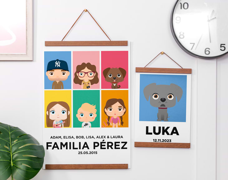 La decoración de una casa dice mucho de las personas que viven dentro de ella, por eso es importante decorar cada estancia con adornos que nos gusten y que reflejen nuestra personalidad al cien por cien. Si sois de esas personas a las que les encanta coleccionar pequeños Tinoks, esta lámina personalizada es perfecta para vosotros. Hecha para que cualquier pareja, familia o persona decore su estancia favorita de la casa. ¡Es genial! Si el estilo pop y cultural te encanta y quieres sorprender a esas personas tan especiales, esta original lámina con diseño de collage Tinok es ideal para tener un detalle de lo más colorido con ellos. Si quieres saber cómo personalizar esta lámina, sigue leyendo porque es muy sencillo. Añade al carrito el producto que quieras y elige hasta 6 personajes Tinok para el collage Pop. ¡Podrás escoger entre nuestros personajes predeterminados o diseñar tu propia figura desde cero! En el interior del diseñador encontrarás también los diferentes tipos de collages Pop con los que contamos, dependiendo del número de personajes escogido. Tendrás que clicar sobre el diseño que se ajuste al número de personajes. Por ejemplo, si quieres un total de 5 personajes para tu producto, tendrás que escoger el diseño titulado "5 personajes". Una vez escogido, podrás crear tus personajes en cada cuadro y escribir el texto que quieras para tu diseño collage. ¡Desde los nombres de todos los miembros de la familia hasta una bonita dedicatoria! Importante: El colgador magnético se incluye únicamente como soporte y no se personaliza. Las medidas de los colgadores magnéticos son: grande 31 cm y pequeño 21 cm. Importante: Si escoges la opción "versión digital" te enviaremos el diseño por mail en alta resolución. De esta manera, tendrá la calidad necesaria para que puedas imprimirla en cualquier formato. En el formulario de entrega tendrás que seleccionar la opción "Recibir por Email para ahorrar los gastos de envío". Importante: El color del marco puede variar según stock.