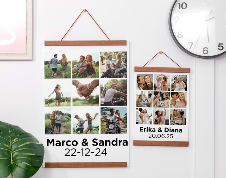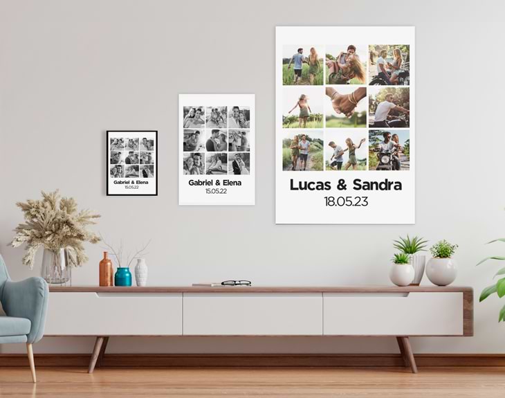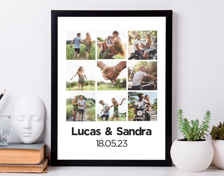 Si quieres sorprender a esa persona tan especial, tenemos algo que le dejará sin palabras. Se trata de nuestra lámina personalizada con diseño "Collage ideal". Es ideal para regalar por San Valentín, por vuestro aniversario, un cumpleaños o simplemente para demostrarle todo el amor que sientes. ¡Le encantará! Lo más especial de esta lámina es que es personalizable. Puedes personalizar este producto con las fotos que tú quieras. Es ideal para pongas esas fotos en las que salgáis guapísimos, esas fotos de algún viaje o de cualquier momento feliz que hayáis vivido. Así siempre que mire esta lámina no podrá evitar sonreir, ¡le encantará! Personalizar esta lámina es súper sencillo. El primer paso a seguir consiste en añadir el producto al carrito y entrar al área de personalización. Una vez ahí, ya puedes poner las fotos con tu amorcito y nosotros nos encargamos de todo lo demás. Pronto estará perfecto y listo para regalar. ¡Será un original regalo para enamorados! Importante: El colgador magnético se incluye únicamente como soporte y no se personaliza. Las medidas de los colgadores magnéticos son: grande 31 cm y pequeño 21 cm. Importante: Si escoges la opción "versión digital" te enviaremos el diseño por mail en alta resolución. De esta manera, tendrá la calidad necesaria para que puedas imprimirla en cualquier formato. En el formulario de entrega tendrás que seleccionar la opción "Recibir por Email para ahorrar los gastos de envío". Importante: El color del marco puede variar según stock.