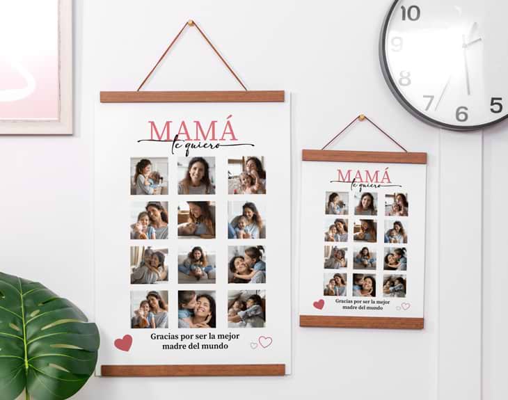 ¿Qué mejor manera de homenajear a la mejor madre del mundo que reuniendo todos esos buenos momentos que habéis vivido juntos? Gracias a esta lamina personalizada podréis hacer un viaje al pasado de lo más nostálgico... ¡Pero siempre de la forma más elegante! Una lámina enmarcada o gigante pensada para colocarla en la estantería o colgarla en la pared. Y es que este lámina con diseño personalizado para mamá será todo un detalle hecho para la mejor madre... ¡Esa que siempre ha estado ahí para su familia! Podrás escoger entre dos opciones de productos para ella: lámina gigante tamaño póster o diploma con marco de tamaño A4. ¡Podrás escoger la opción que mejor te venga para tu regalo! Importante: El colgador magnético se incluye únicamente como soporte y no se personaliza. Las medidas de los colgadores magnéticos son: grande 31 cm y pequeño 21 cm. Es el mejor momento para sorprender a la mejor mamá del mundo con este regalo original para el Día de la Madre. ¡Seguro que no se lo esperará! En el interior del diseñador encontrarás dos versiones del diseño: "Te quiero" y "Te queremos". Escoge la versión que más te guste y personalízala, añadiendo las imágenes a través de los cuadros de foto delimitados en la plantilla. ¡Súbelas al sistema y ajústalas al diseño! Importante: El color del marco puede variar según stock.