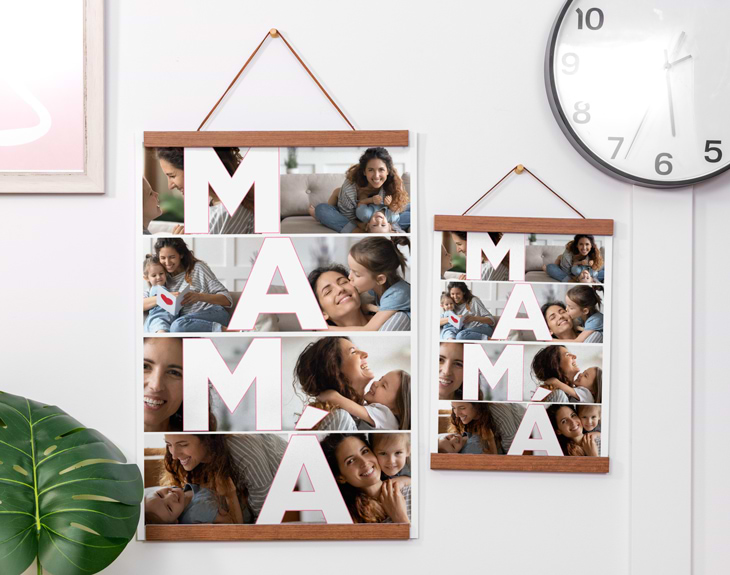 Hay momentos que merece la pena enmarcar. Esos pequeños pedacitos de rutina son tan bonitos que sería genial poder recordarlos día a día. Para que los puedas ver en tu pared o en tu estantería, puedes inmortalizarlos sobre esta lamina personalizada a color. Busca las mejores fotografías que tengas con tu madre y sorpréndela en su cumpleaños. ¿Por qué conformarte con un único marco de fotos cuando puedes tener un original soporte para varias fotos? No se trata de un diploma para mamás normal, sino que incluirá las fotos más bonitas alrededor del diseño con las letras de MAMÁ. ¡Así sabrá que es exclusivamente para ella y será un sorprendente regalo original para el Día de la Madre! Al personalizar el producto en el carrito, podrás añadir hasta ocho fotografías desde cualquier dispositivo y ajustar el tamaño libremente. ¡Verás en todo momento cómo queda el resultado final de tu personalización! Importante: El colgador magnético se incluye únicamente como soporte y no se personaliza. Las medidas de los colgadores magnéticos son: grande 31 cm y pequeño 21 cm. Crea fácilmente tu diseño del Día de la Madre y decide si quieres imprimirlo en lámina gigante tamaño póster o diploma con marco negro de tamaño A4. ¡También puedes escoger diferentes colores de contornos para las letras! Importante: El color del marco puede variar según stock.
