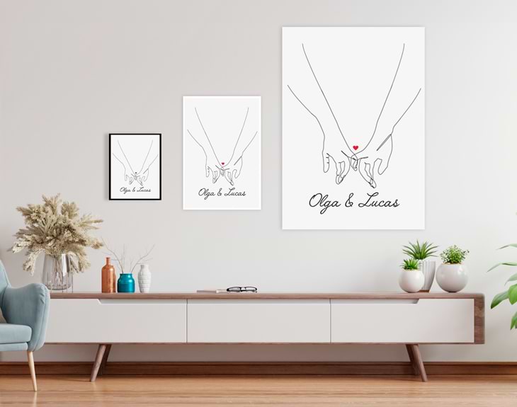 Por fin se acerca la época más bonita y romántica del año... ¡El día de los enamorados! Si este año quieres sorprender a tu pareja por San Valentín, nuestra lámina personalizada con diseño "Pinky promise" será un regalo súper romántico para esta ocasión. Y es que uno de los pilares de una relación tiene que ser el compromiso, por eso tu pareja siempre tiene que cumplir todas vuestras pinky promise, nuestra lámina personalizada reflejará vuestra relación al 100%. Es una preciosa forma de demostrarle lo mucho que significa para ti. Lo mejor es que es personalizable. ¡Podrás poner vuestros nombres en esta lámina! Personalizar esta lámina es súper sencillo. El primer paso a seguir consiste en añadir el producto la carrito y entrar al área de personalización. Una vez ahí, ya puedes escribir los nombres que tú quieras. Pronto estará perfecta y lista para regalar. ¡Será un regalo original para enamorados! Importante: Si escoges la opción "versión digital" te enviaremos el diseño por mail en alta resolución. De esta manera, tendrá la calidad necesaria para que puedas imprimirla en cualquier formato. En el formulario de entrega tendrás que seleccionar la opción "Recibir por Email para ahorrar los gastos de envío". Importante: El color del marco puede variar según stock.
