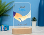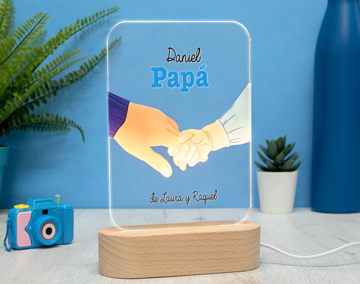 Papá siempre está ahí cuando más lo necesitamos. Nuestro padre siempre nos ha dado la mano en los momentos más complicados y es el momento de hacerle un homenaje. Esta lámpara de metacrilato personalizada iluminará todos y cada uno de sus días... ¡Recordando al maravilloso/a hijo/a que tiene! Una placa de metacrilato iluminada por una base, que puede ser de madera o de color negro. ¡Crea un regalo único para papá! Y es que esta lámpara de metacrilato con diseño para papá está hecha para sorprender al mejor padre del mundo. El metacrilato incluye este diseño tan emocionante hecho exclusivamente para padres, y cuenta con unas medidas de 18,4 centímetros de alto por 13 centímetros de largo. Por otro lado, cada base tiene unas medidas y cualidades distintas. La de madera cuenta con una sola luz blanca que ilumina todo el metacrilato mientras que la negra es más pequeña pero cuenta con varias luces de colores. ¡Podrás diseñar tu regalo a tu gusto! Este será el regalo original para padres más simbólico con el que podrás sorprender en cualquier ocasión especial... ¡Incluso en el Día del Padre! ¿Cómo podrás personalizar este producto? Escoge el tipo de producto que quieres (puedes incluso grabar el texto que quieras en la base) y entra en el área de personalización. Ahí solo tendrás que poner los nombres que quieras en los cuadros de texto. ¡Nosotros nos ocuparemos de plasmarlo sin problema en el metacrilato! Funcionamiento: La lámpara funciona con un cable USB (incluido). La base negra cuenta con diferentes colores, que se pueden adaptar a tus gustos: si pulsas una vez te saldrá un color, si pulsas de nuevo, aparecerá otro, y así sucesivamente. También podrás elegir la opción intermitente: ¡todas las luces creando un festín de colores! Mientras tanto, la base de madera solo cuenta con una luz, que se apagará y se encenderá cada vez que aprietes el interruptor. Puedes escoger entre las siguientes bases: -Base negra: sus medidas son de 8,3x4,8cm, y está hecha de plástico. Cuenta con luces de colores -Base de madera: sus medidas son de 14,5x6x3,5cm, y está hecha de madera. Cuenta con una sola luz, de color blanco ¡Importante! Por muy poco más, puedes seleccionar la opción de tener la base de madera grabada por un lado. Añade ese producto al carrito y podrás escribir un breve texto (nombres, fechas...) que irá grabado directamente sobre la madera para que dure eternamente. Importante: recomendamos no limpiar con líquidos, sólo con un paño en seco o ligeramente húmedo, y evitar los productos químicos. Importante: puede que el metacrilato llegue con un plástico protector. Medidas del metacrilato 18,4 x 13 cm