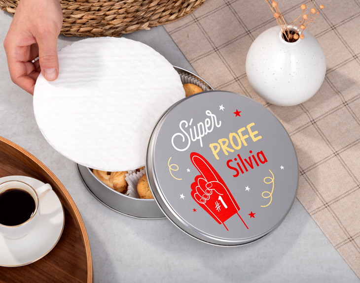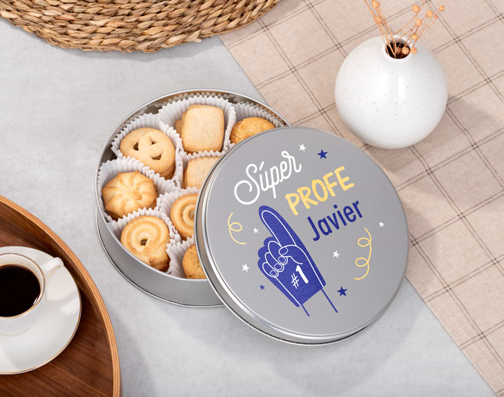 Alegrar el día de vuestro profe no es difícil si lo hacéis con esta deliciosa lata de galletas personalizada que le conquistará tanto el corazón como el estómago. Y es que después de un curso escolar agotador, que mejor que sorprender a vuestro profe con las galletas más ricas del mundo. Fin de curso es el mejor momento para regalar esta original lata de galletas a ese profe que lo ha dado todo este año y os ha enseñado miles de cosas. Porque es lo mínimo que se merece un profe de parte de su clase favorita. ¡Además su diseño le encantará! Y espera porque todavía queda la mejor parte: ¡personalizar la lata de galletas! Entra en nuestro diseñador, elige el diseño que más te guste y complétalo con el nombre de vuestro profesor o profesora para que quede increíble. Nosotros nos encargamos de plasmar el diseño en la tapa de la lata para que no pase desapercibido. ¡Triunfaréis con este regalazo! Diámetro: 19 cm. Peso: 277g aprox.
