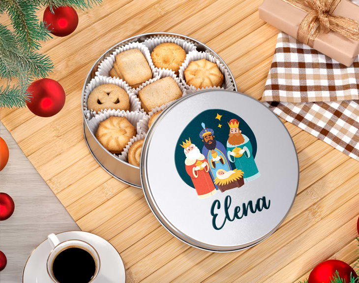 Este año, los Reyes Magos llegan de una manera deliciosa: ¡en forma de galletas de mantequilla! Un sabor tradicional que nunca pasa de moda, y mucho menos si viene presentado en una lata de galletas personalizada. En la tapa, la magia se hace presente con la ilustración de Baltazar, Gaspar y Melchor, dándole un toque original a tu regalo. Lo mejor de todo es que podrás personalizar la lata con un nombre o una frase especial, haciendo que este detalle sea único y personal. Un regalo perfecto para sorprender a tus seres queridos en estas fiestas, pero también en cualquier momento del año, porque esta lata no solo es un detalle navideño, sino un bonito recuerdo para guardar lo que desees una vez que las galletas (¡que volarán en un abrir y cerrar de ojos!) se hayan terminado. Dentro de la lata encontrarás unas deliciosas galletas de mantequilla en distintas formas, ideales para compartir con quien más te apetezca. Este regalo de Reyes Magos personalizado es perfecto para sorprender a un miembro de la familia, a tus amigos o incluso a los más peques. Personalizar tu regalo es muy sencillo: solo tienes que añadirlo al carrito y escribir el nombre o mensaje que desees. En unos pocos pasos, tendrás en tus manos el regalo original navideño más dulce. ¡Este año, triunfa con un detalle que hará sonreír a todos! Diámetro: 19 cm. Peso: 227g aprox. Importante: El peso y color de la lata puede variar según stock.