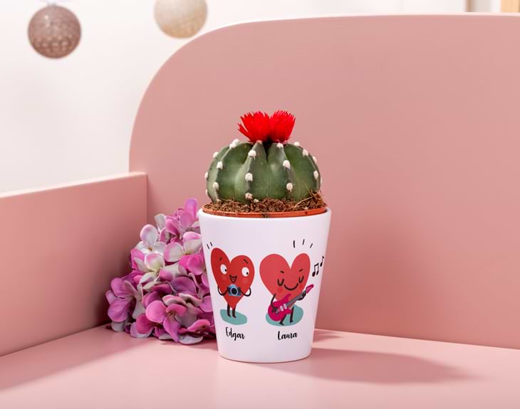 Nuestra preciosa maceta personalizada Familia Corazones es un regalo tan cargado de amor que ni los corazones más duros podrán resistírsele. Un detalle ideal para sorprender a tu pareja, con el que daréis un toque de lo más romántico a vuestra plantita favorita. A la hora de hacer el pedido, puedes escoger entre un catálogo de 85 personajes con corazones de diferentes tamaños, formas y acciones. ¿Sois una familia de lo más amorosa? Entonces la pareja con el pequeño bebé corazón será perfecto para vosotros. ¿Tu pareja y tú estáis a punto de casaros? ¡Echa un vistazo a nuestros corazones vestidos de novios! Hay un montón de divertidas versiones entre las que escoger, para hacerte con un diseño único y de lo más adorable. Si se acerca vuestro aniversario y sois unos enamorados de la jardinería, esta preciosa maceta personalizada es un regalo ideal para sorprender a quién más quieres. Buscad una plantita que os guste y reavivar vuestro amor cuidándola juntos en vuestra nueva maceta especial. ¡Un regalo cargado de amor y simbolismo! Importante: a partir de 6 personajes, se distribuirán en dos filas. Es decir: - Familia de 6 personajes: 3 en la fila superior, y 3 en la inferior. - Familia de 7 personajes: 4 en la fila superior, y 3 en la inferior. - Familia de 8 personajes: 4 en la fila superior, y 4 en la inferior. Importante: el cactus puede incluir flor o no según stock.
