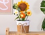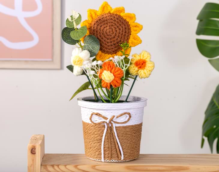 • Maceta con flores de crochet. • Girasol de madera personalizado. • Tarjeta Recordatoria.