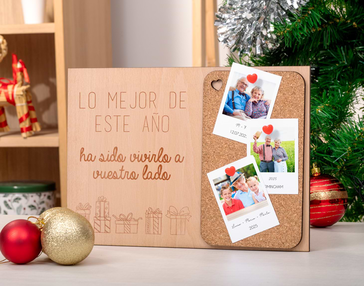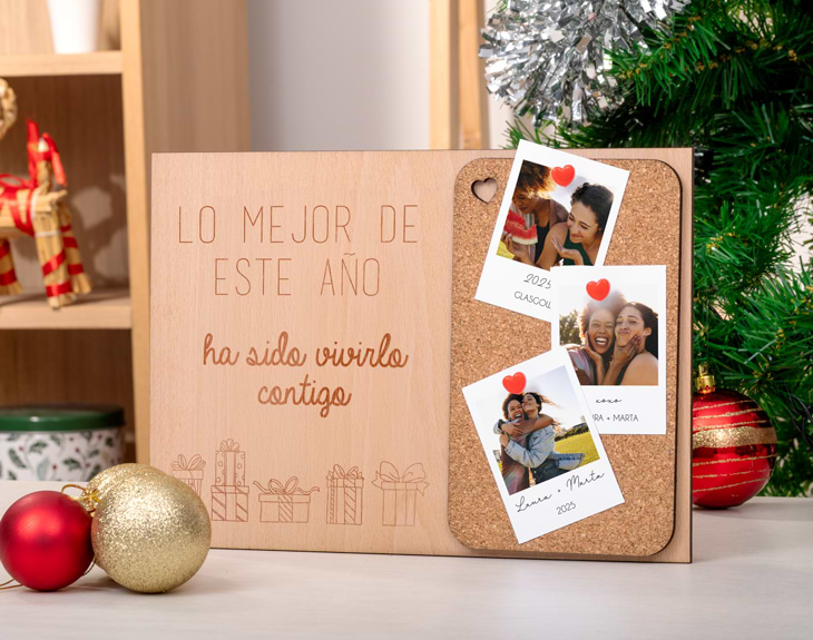Si te paras a pensar en todo lo vivido este año, seguro que te costaría elegir solo un momento. Por eso, esta madera con corcho y fotos tipo Polaroid es perfecta para reunir tres recuerdos que marcaron tu año. No hay nada más bonito que sorprender a esa persona que ha llenado tus días de instantes felices. La madera incluye un mensaje grabado que emociona, porque es verdad que los momentos se viven mejor cuando se comparten con alguien especial. Lo mejor es que podrás personalizar las tres Polaroid, eligiendo tanto las fotos como el texto que irá debajo de cada una. Añade una fecha, un lugar o una frase que lo haga aún más vuestro. ¡Será un recuerdo personalizado de ensueño! Personalizarlo es muy sencillo: sube tus tres fotos favoritas y escribe un mensaje que refleje lo importante que es esa persona para ti. Nosotros nos encargaremos de montar este precioso detalle para que, al recibirlo, sienta todo vuestro cariño. Haz que este Navidad esté llena de los recuerdos más importantes del año. Medidas de la madera: 30 cm x 21 cm